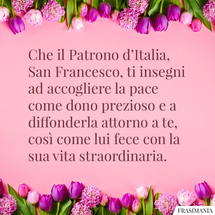 Che il Patrono d’Italia, San Francesco, ti insegni ad accogliere la pace come dono prezioso e a diffonderla attorno a te, così come lui fece con la sua vita straordinaria.